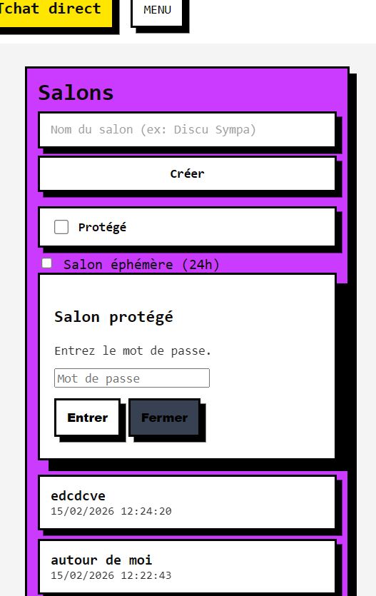 Tchat Direct reprend l’idée du tchat en ligne anonyme, mais avec une interface plus récente : meilleure lisibilité, gestion des rooms publiques et privées, URL dédiée par salon, et inscription simplifiée.
